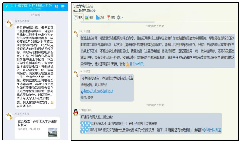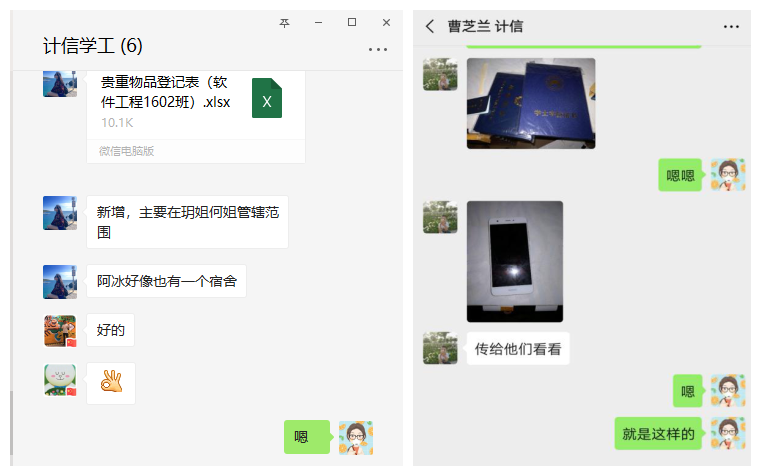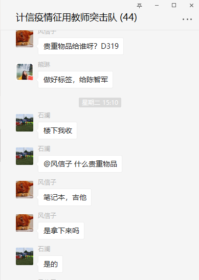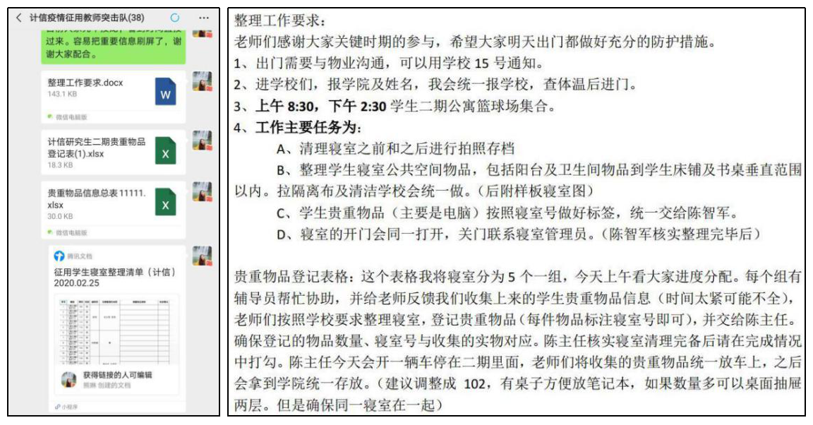 “计信疫情征用教师突击队”微信群发送整理工作要求、员工贵重物品登记信息
