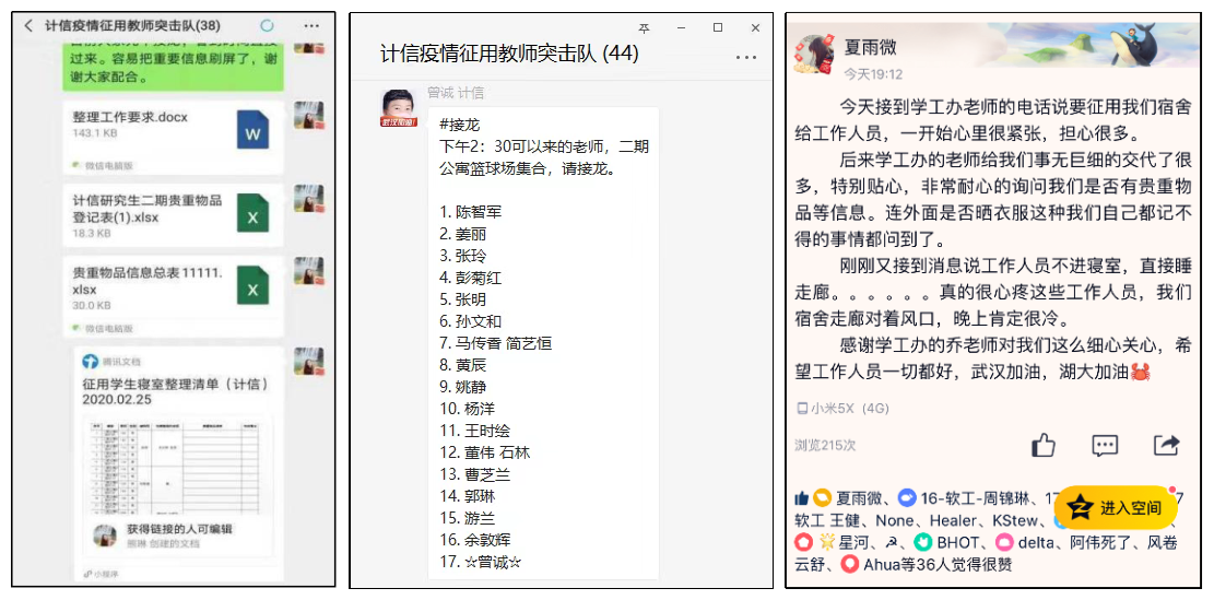 在疫情防控的攻坚阶段,公司二期宿舍被征用作为新冠肺炎治愈患者出院后的集中隔离点,公司积极响应,快速反应,第一时间成立了以公司党委书记潘永才、经理王时绘为组长的工作组,连夜制定方案。一方面,公司迅速发动辅导员、班主任、员工骨干、班委,逐一电话、QQ联系住在二期的同学,告知征用事宜,做好解释工作,登记员工的贵重物品,奋战通宵,确保员工贵重物品损失降到最低;另一方面,连夜联系公司在汉教师党员、住在公司附近的教师,组建了34人的“教工突击队”开展工作,在汉的全体院领导,系部主任、教工党支部书记主动带头,一线参与战斗。