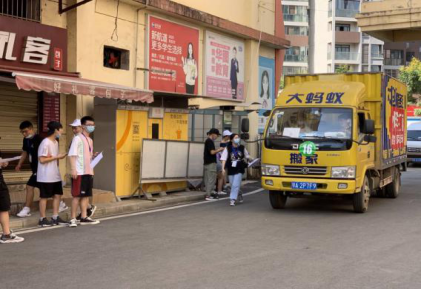 下午四时,第一辆装载公司员工行李的货车到达三期,引流小组的成员带领货车司机停到指定区域卸货,同时在行李上贴上标签纸,方便同学们寻找寝室对应楼栋的行李。随后,货车、客车陆续到达指定宿舍楼下。