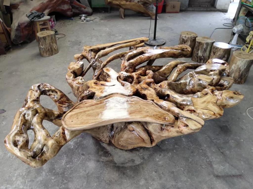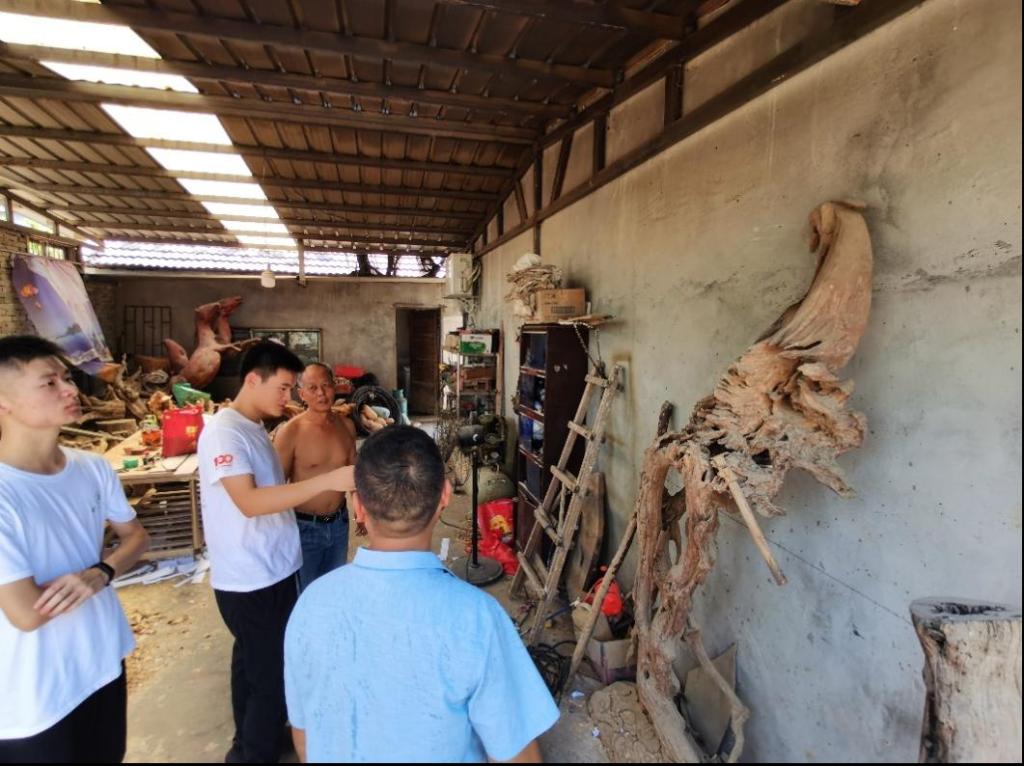 接着探访团队又参观了根雕技艺中心。“这是市博物馆找我定制的根雕作品,根雕工艺讲究‘三分人工,七分天成’,作品处于初始阶段,循着根系的形状可以把它雕琢成一只浴火的凤凰。”根雕技艺传承人柯师傅热情地向团队成员介绍着根雕文化和眼前的作品。根雕艺术是发现自然美而又显示创造性加工的造型艺术,主要利用根材的天然形态来表现艺术形象,辅助性进行人工处理修饰。柯师傅家已经四代传承和发扬根雕这门技艺,并不断有想学习根雕的人前来拜师学艺,根雕文化也一定会在当地继续发展,向更广阔的区域传播。
