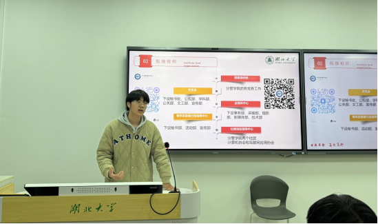 在“榜样面对面”环节,2021级本科生赵雨秋为学弟学妹分享了员工干部工作经验,他介绍了校、院级员工组织,建议学弟学妹们根据兴趣及自身发展需求加入团学组织。面对如何平衡学习与工作的问题,他表示,学习与工作就像主要矛盾和次要矛盾,同学们要集中力量解决学习这一主要矛盾,这是决定自身发展的关键因素,同时也不能忽视工作这一次要矛盾,合理分配时间与经历,让学习与工作相互贯通。