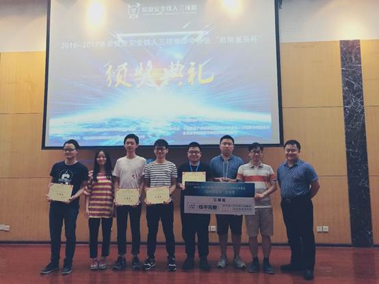 “HuBu”团队由14级信息安全专业尹普、吴建良、刘若晨、刘紫琴,15级信息安全专业肖海涛、徐宽,共6名同学组成。在4月8日的“信息安全铁人三项赛”之线上资格赛上,公司团队表现优异,成功取得晋级赛资格。在6月的晋级赛中,团队同华中地区的武汉大学、华中科技大学、郑州大学等12所高校同台竞技,凭借各成员稳定的发挥和扎实的知识功底,最终取得企业赛三等奖,数据赛、个人赛优秀奖的好成绩。