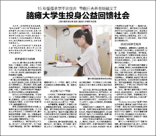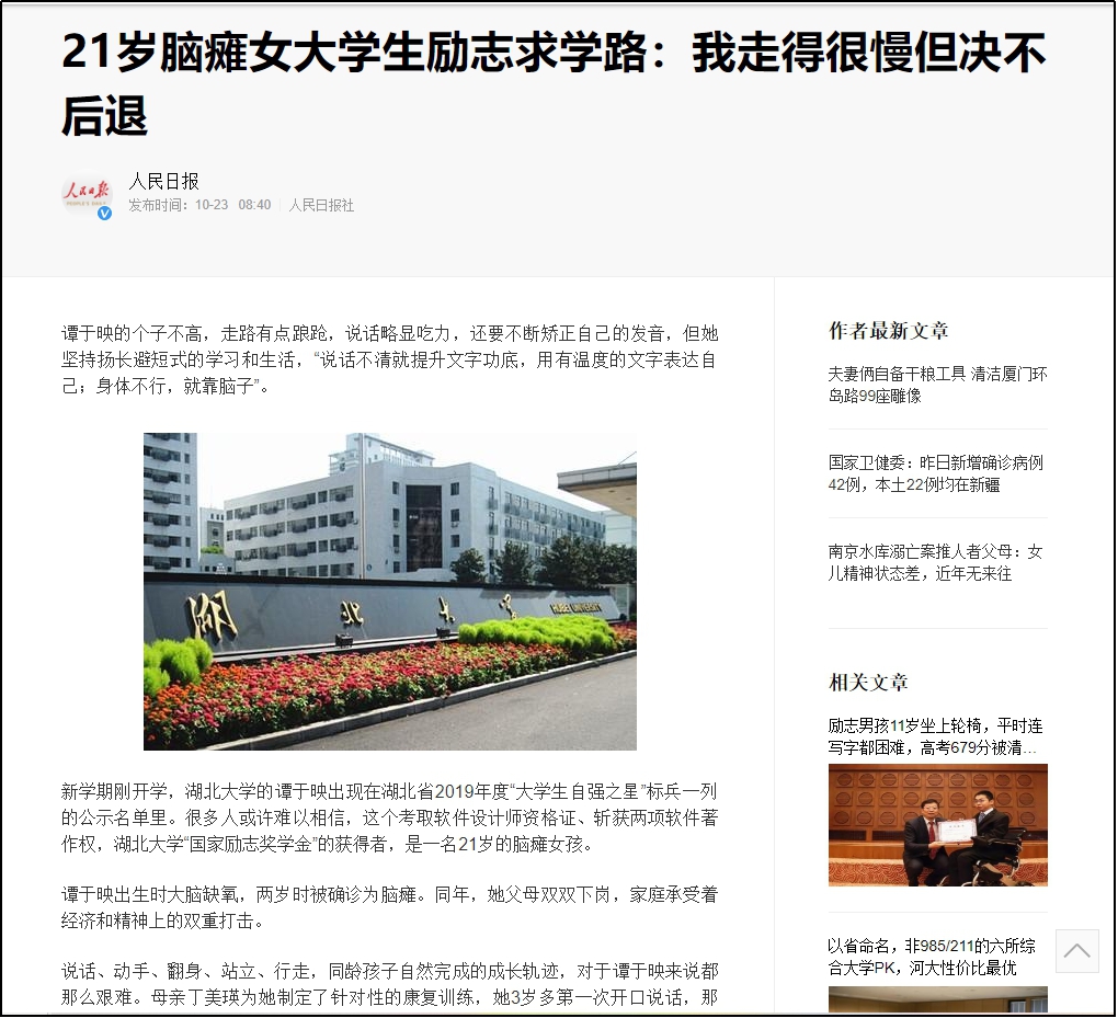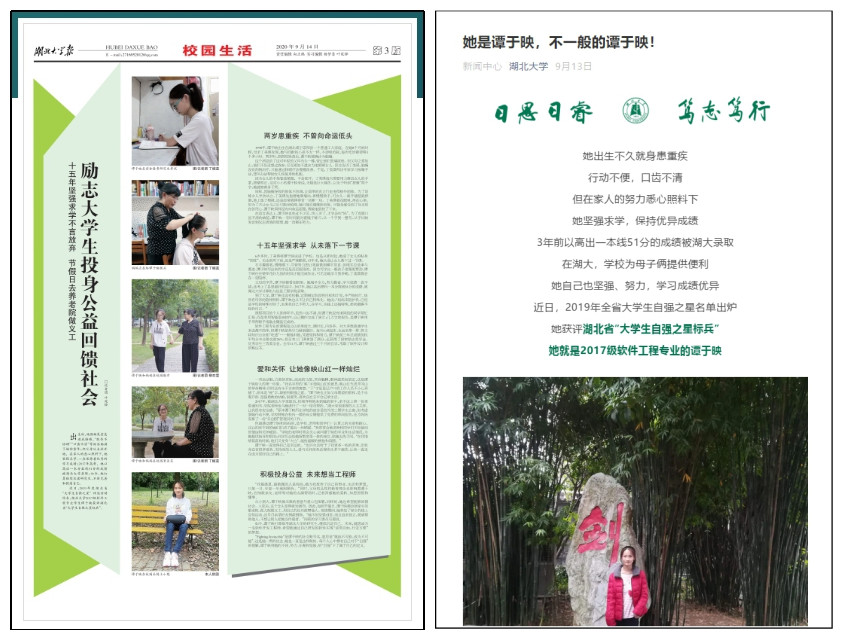 谭于映乐观坚强的求学事迹近期被各大媒体关注,9月10日,《楚天都市报》以《15年坚强求学不言放弃 节假日去养老院做义工 脑瘫老员工投身公益回馈社会》为题,大篇幅报道报道谭于映坚强求学、热心公益的自强事迹。随后,9月14日,《英国威廉希尔WilliamHill校报》第1205期第3版“校园新闻”以《十五年坚强求学不言放弃节假日去养老院做义工 励志老员工投身公益回馈社会》为题,“英国威廉希尔WilliamHill”官方微信公众号以《她是谭于映,不一样的谭于映!》,分别整版报道谭于映的榜样事迹。10月23日,《中国青年报》在当日发行报纸的第5 版以《21岁脑瘫女老员工励志求学路:我走得很慢但决不后退》为题报道了谭于映的自强求学事迹,新闻发出后被人民日报、新华网、中国经济网等多家媒体争相转载。