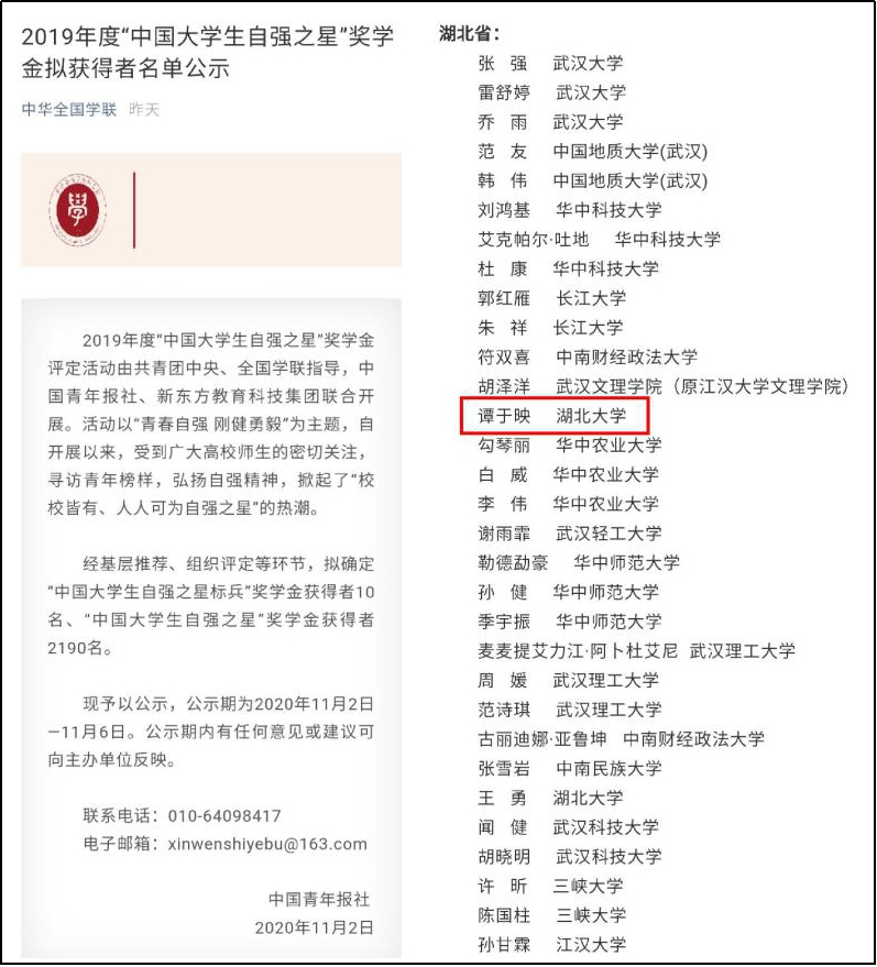 近日,由共青团中央、全国学联指导,中国青年报社、新东方教育科技集团联合开展的以“青春自强 刚健勇毅”为主题的2019年度“中国老员工自强之星”奖学金评定名单出炉。公司2017级软件工程专业谭于映同学作为榜样引领自强典型脱颖而出,成为2190名“中国老员工自强之星”奖学金获得者中的一员。同时,她还是湖北省2019年度“老员工自强之星”标兵,也是公司第一次获评是湖北省自强之星标兵。