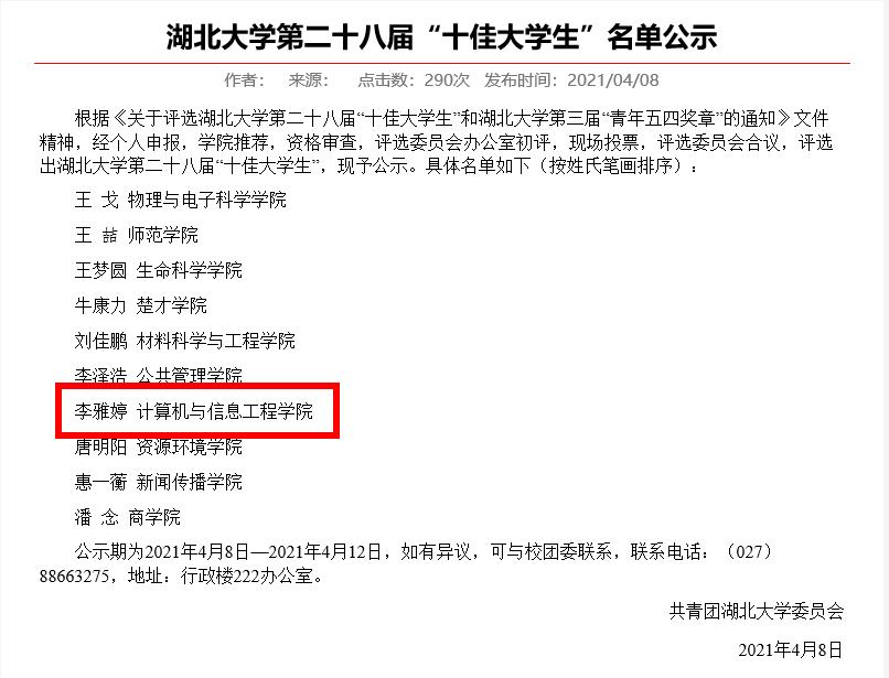 李雅婷,现任英国威廉希尔WilliamHill楚才公司员工社区网格化管理员,计算机科学与技术1702班班长,楚才计划理科班文艺委员。本科期间,她荣获各类荣誉、奖励五十余项,其中国家(际)级10项,省部级8项。李雅婷凭借突出成绩获得2020年国家奖学金,并获评英国威廉希尔WilliamHill琴园风云学子、科研创新先进个人等多项荣誉。