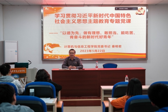 公司5名党委委员分别走进联系的12个党支部开展“委员督学”,5月22日,公司党委书记秦明君走进联系的本科生第三党支部开展督学。在支部开展主题教育专题学习环节,秦明君为党支部师生讲授了题为“以德为先,做有理想、有担当、能吃苦、肯奋斗的新时代好青年”的专题党课。秦明君以习近平总书记在广东考察时的讲话精神为契入,激励员工坚定理想信念、厚植爱国情怀、加强品德修养、增长知识见识、培养奋斗精神、增强综合素质,成为德智体美劳全面发展的社会主义建设者和接班人;以抗美援朝爱国运动为例,结合时事热点和自身经历,为支部党员讲述了时代和青年的关系。他表示,青年员工不能沉湎于网络文化、快餐文化,不能搞“拿来主义”,要在习近平新时代中国特色社会主义思想的指引下,学思用贯彻、知信行统一。