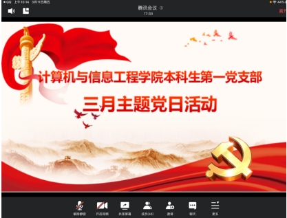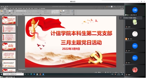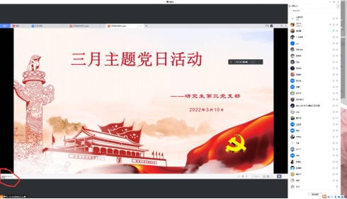 3月10日,研究生第三党支部3月份主题党日活动通过腾讯会议召开,活动由支部书记谌雨章主持,主要学习全国两会精神和十九届中央纪委六次全会精神。会议中支部书记谌雨璋强调研究生党员学习全国两会精神的重要性,作为一名党员需时刻牢记自身的使命,听党指挥、不负嘱托;指出支部内存在的问题,并强调今后党支部内将更多地花心思、花时间在“三会一课”上,为创建一个良好学习氛围的党支部而不懈努力。支部党员陈迪来表示,作为一名研究生党员,要把学习贯彻全国两会的精神转化为做好研究生本职工作的实际行动,发扬斗争精神,增强斗争本领,坚定信心,勇于担当,为迎接党的二十大胜利召开贡献力量。